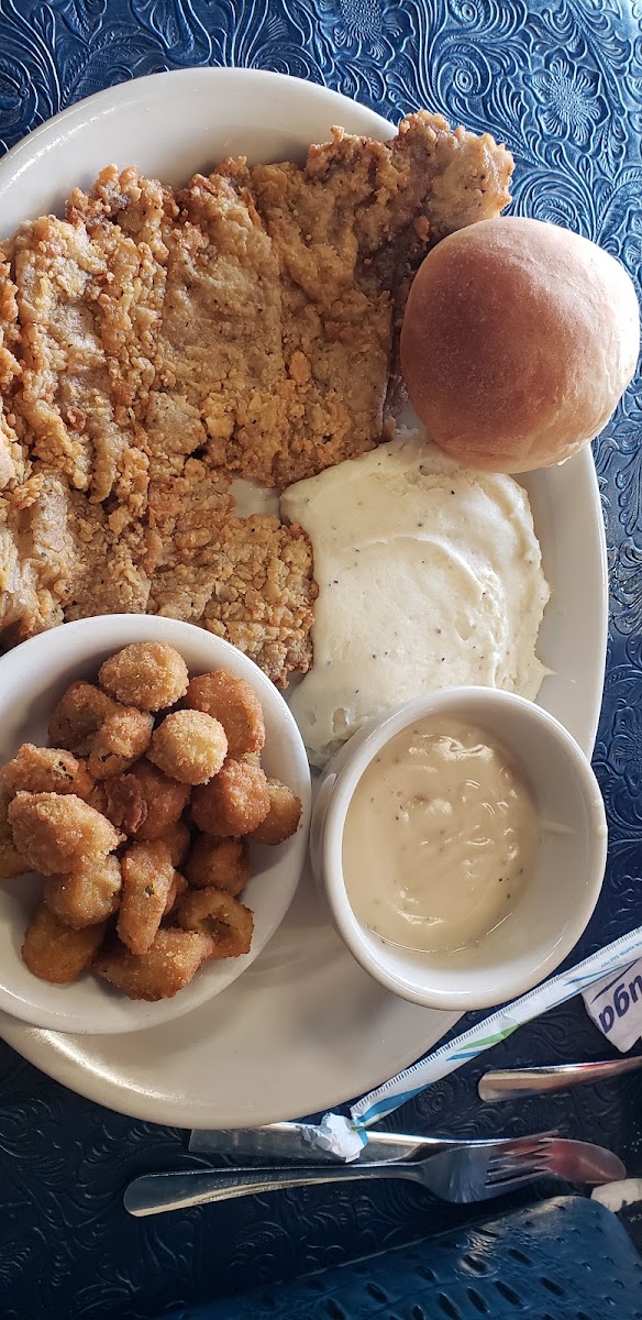 Chicken Fried Steak with Cream Gravy Mashed Potatoes Fried Okra and a Roll